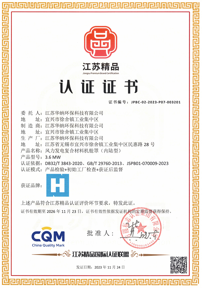 江蘇華納環(huán)保科技有限公司座落于全國環(huán)保產(chǎn)業(yè)之鄉(xiāng)-江蘇省宜興市,地處滬、寧、杭等距離的中心地帶,交通便利。注冊資本7066.66萬人民幣,公司主要是從事玻璃鋼復(fù)合材料、環(huán)保設(shè)備的設(shè)計(jì)、開發(fā)、制造、銷售于一體的科技型企業(yè),是國家高新技術(shù)企業(yè),國家專精特新小巨人企業(yè),主要產(chǎn)品風(fēng)力發(fā)電機(jī)艙罩、導(dǎo)流罩,廢氣廢水處理環(huán)保設(shè)備。